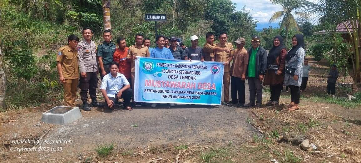 Kepahiang, Publikpost.com- Melalui Dana Desa tahun anggaran 2025, Pemerintah Desa Temdak Kecamatan Seberang Musi Kabupaten Kepahiang Provinsi Bengkulu, pada hari ini melaksanakan Musyawarah Desa untuk menjelaskan kepada masyarakat dalam keterbukaan realisasi penggunaan anggaran dana desa. Pelaksanaan musyawarah tersebut di laksanakan di balai desa setempat dan di hadiri oleh Camat Seberang Musi, Kapolsek, DPMD Kabupaten pada hari Senin (08/09/2025).
