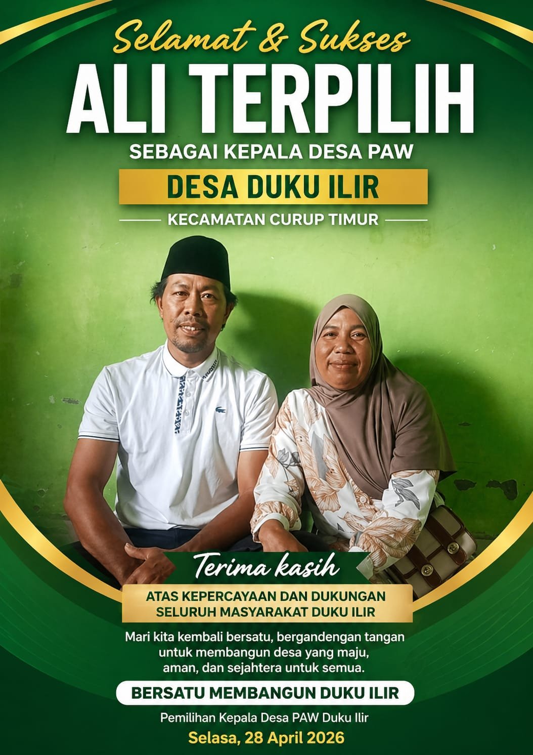 Dengan terpilihnya Ali sebagai Kepala Desa PAW, masyarakat kini menaruh harapan besar agar transisi kepemimpinan di Desa Duku Ilir dapat membawa dampak positif bagi kemajuan desa serta meningkatkan kesejahteraan masyarakat setempat.(nz)