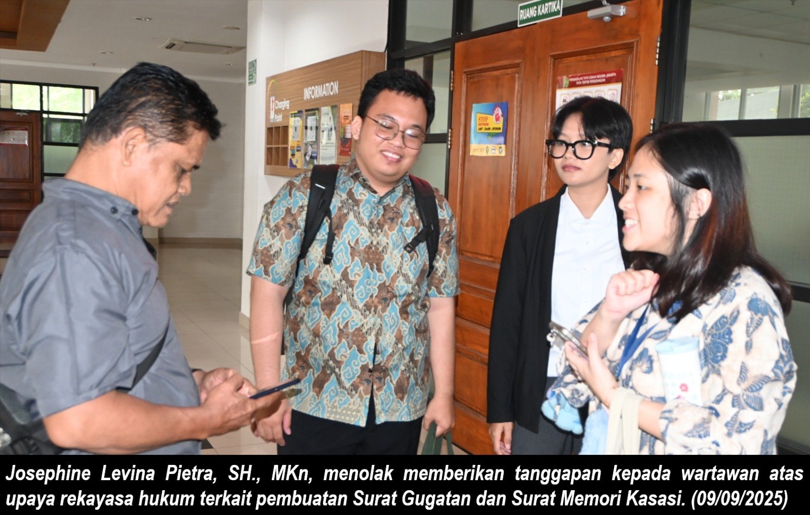 Usai sidang perkara ini, kuasa hukum Penggugat, Josephine Levina Pietra, yang hadir didampingi dua orang magang, menolak memberikan tanggapan kepada wartawan yang menanyakan upaya rekayasa hukum terkait pembuatan Surat Gugatan Perkara 212/G/2025/PTUN.JKT dan Surat Memori Kasasi Perkara No. 2070 K/PDT/2025.